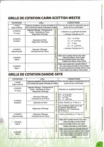 Les cotations servent à hiérarchiser les terriers d’Ecosse en prenant en compte les différents examens ou tests passés, les qualificatifs et les places obtenus lors des expositions, ainsi que le classement de leur progéniture.